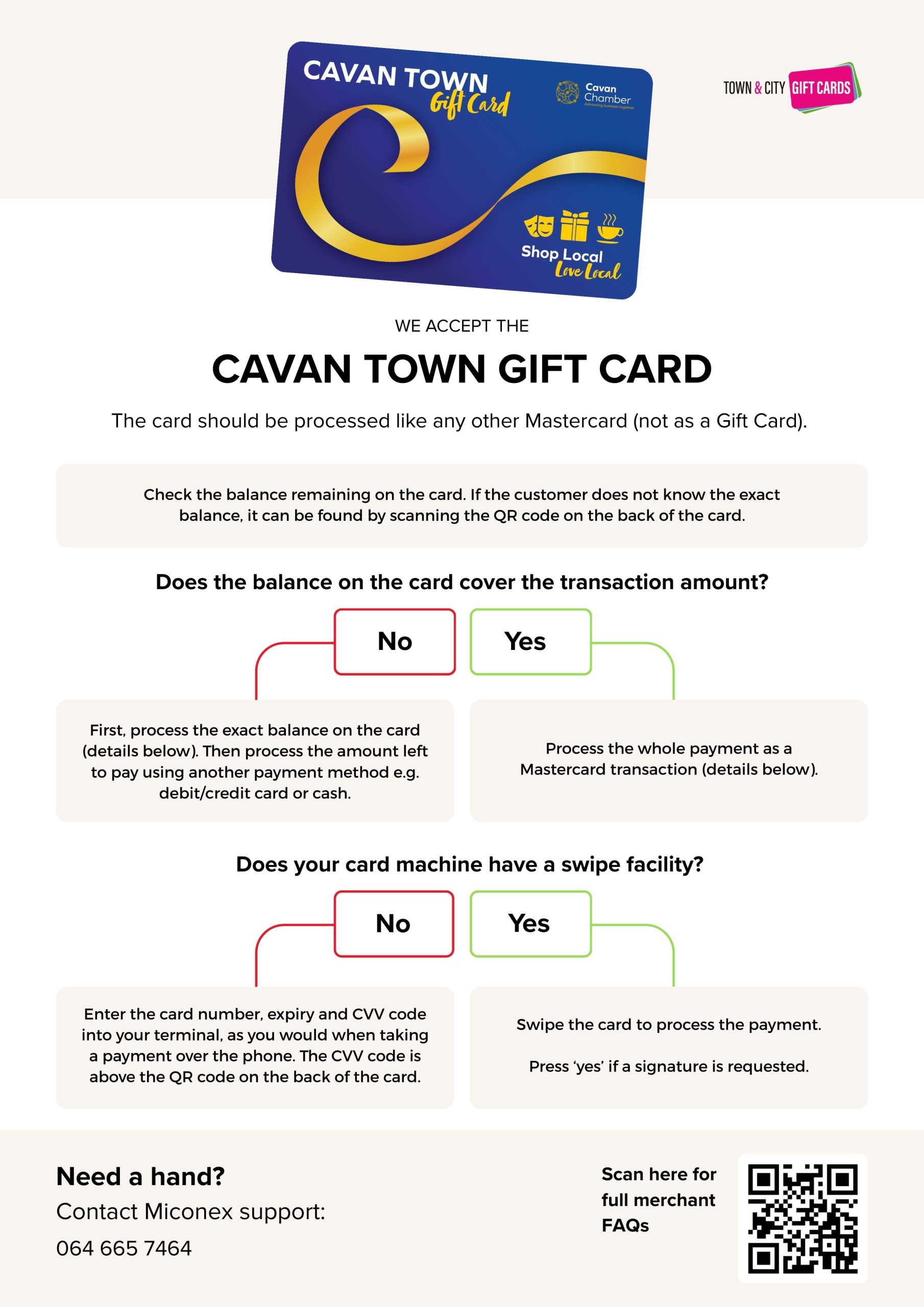 From reminding staff to process the card as a Mastercard to how to accept split payments, how to check the balance to the customer service number, place this cheat sheet at your till point and make accepting Town & City Gift Cards simple.